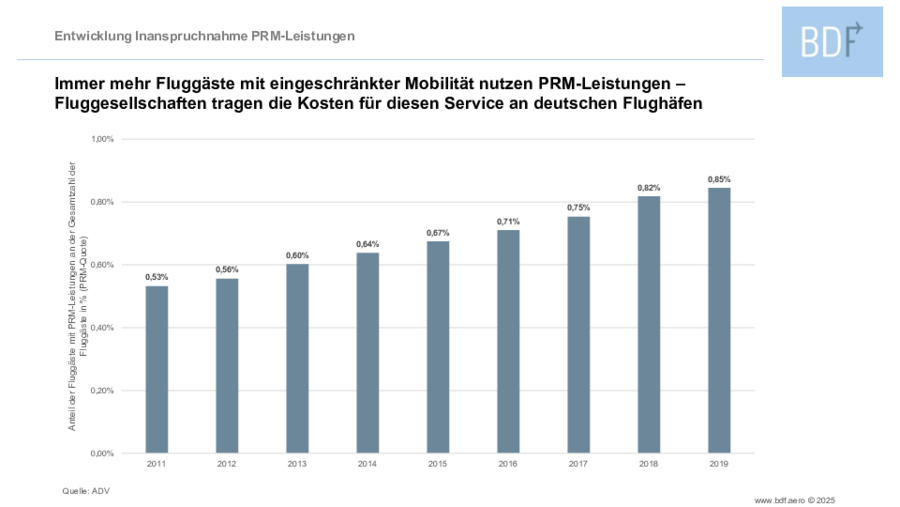 Die PRM-Leistungen ermöglichen immer mehr Menschen mit eingeschränkter Mobilität das Reisen mit dem Flugzeug. Damit leisten die Fluggesellschaften einen wichtigen Baustein zur sozialen Integration der Betroffenen. Und auch der Anteil von Menschen mit eingeschränkter Mobilität an der Gesamtzahl der Fluggäste an deutschen Flughäfen nimmt kontinuierlich zu. Während der Anteil der Menschen, die PRM-Leistungen an den Flughäfen in Anspruch nehmen, im Jahr 2011 noch bei 0,53% aller Fluggäste lag, stieg er bis 2019 auf 0,85%.