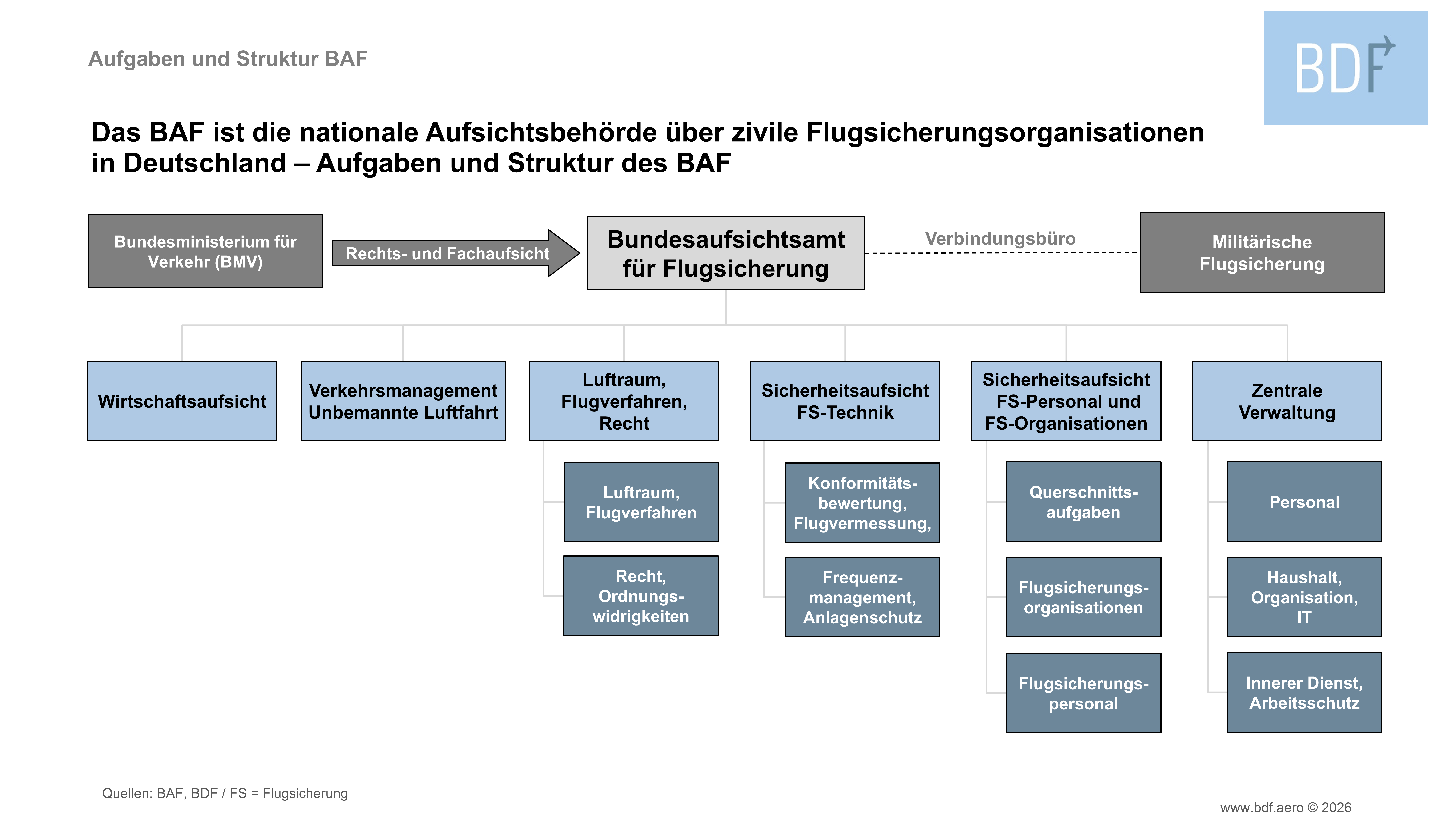 Ein wesentlicher Bestandteil der Single-European-Sky-Verordnungen ist die Trennung der Erbringung von Flugsicherungsdiensten und deren Beaufsichtigung durch unabhängige Institutionen. In Deutschland ist das BAF vom Gesetzgeber mit der Aufsicht über die Flugsicherungsdienste betraut worden. Die Rechts- und Fachaufsicht über das BAF obliegt dem Bundesministerium für Verkehr (BMV).