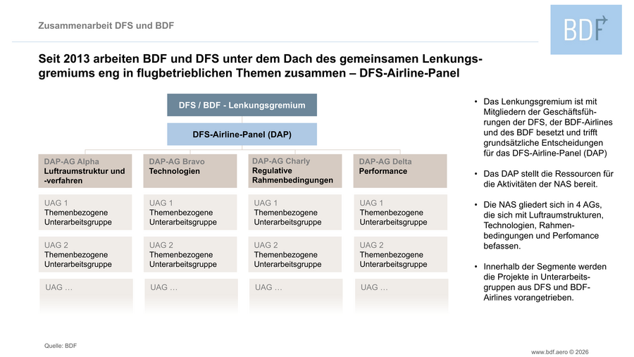 Seit 2013 arbeiten die DFS und die BDF-Fluggesellschaften in einer gemeinsamen Arbeitsgruppe an solchen Verbesserungen. In verschiedenen Unterarbeitsgruppen werden vielfältige Ansätze zur Flugoptimierung verfolgt. Im Jahr 2025 wurde die Zusammenarbeit als DFS-Airline-Panel neu strukturiert. Da viele Optimierungsmaßnahmen längere Vorbereitungszeiten und Pilotphasen erfordern, sind verlässliche und langfristig angelegte Kooperationsstrukturen von zentraler Bedeutung. Diese werden durch die Unterstützung der Vorstände und Geschäftsführungen auf beiden Seiten getragen. Im gemeinsamen DFS/BDF-Lenkungsgremium werden auf Leitungsebene wesentliche Initiativen angestoßen und dauerhaft begleitet. Der BDF koordiniert dabei die Arbeit auf Airline-Seite sowohl zwischen seinen Mitgliedern als auch in der Zusammenarbeit mit der DFS.