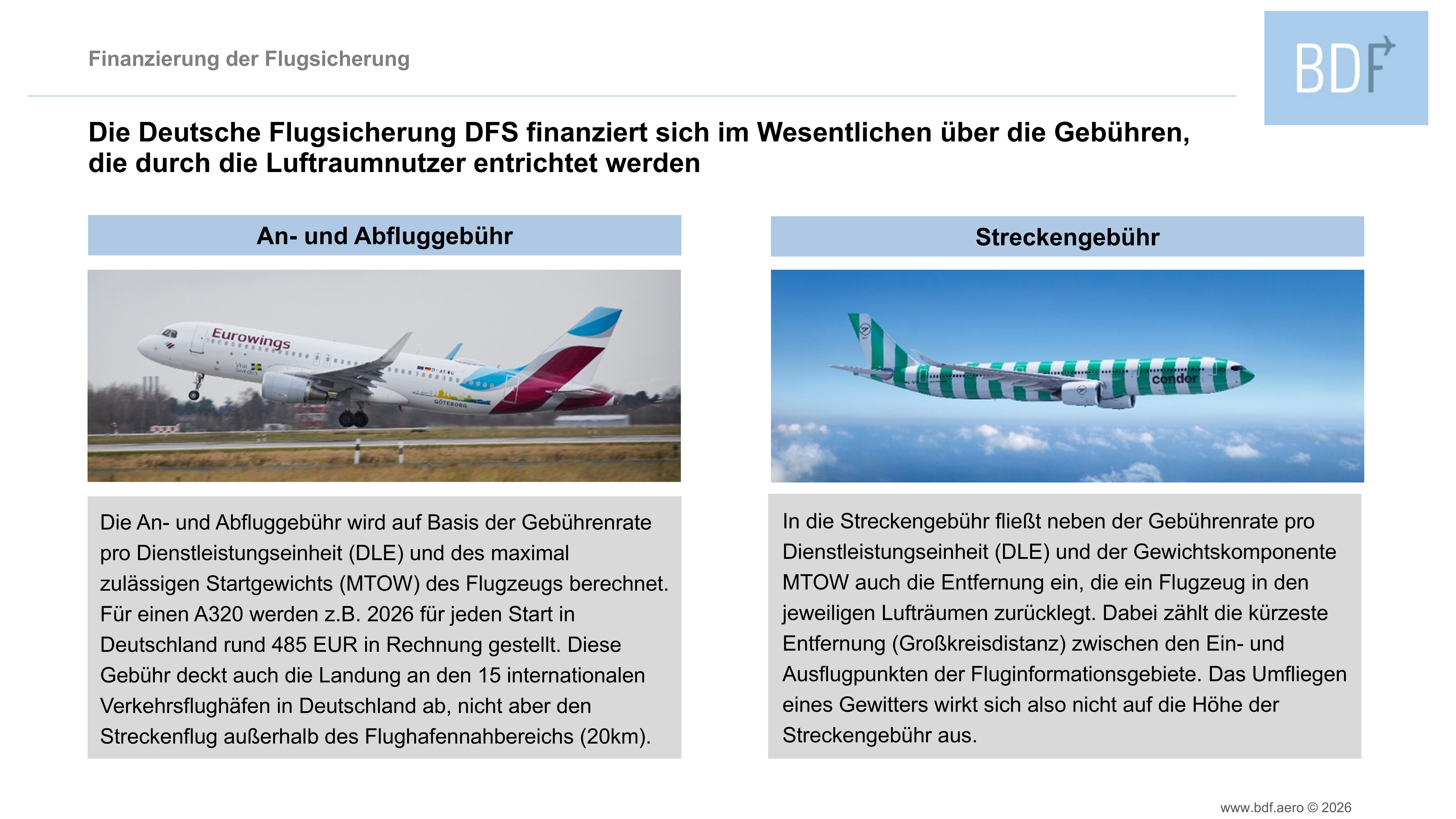 Zu den flugsicherungsbezogenen Kosten zählen insbesondere die Aufwendungen für die Deutsche Flugsicherung (DFS) im unteren und oberen Luftraum sowie die Kosten des Maastricht Upper Area Control Centre (MUAC), das für die Flugsicherung im oberen Luftraum über Nordwestdeutschland zuständig ist. Hinzu kommen die Kosten für die Sicherung der An- und Abflüge an den deutschen Flughäfen sowie die Aufwendungen für den Flugwetterdienst des Deutschen Wetterdienstes (DWD), für das Bundesaufsichtsamt für Flugsicherung (BAF) und für die Fachaufsicht im Bundesministerium für Verkehr (BMV).