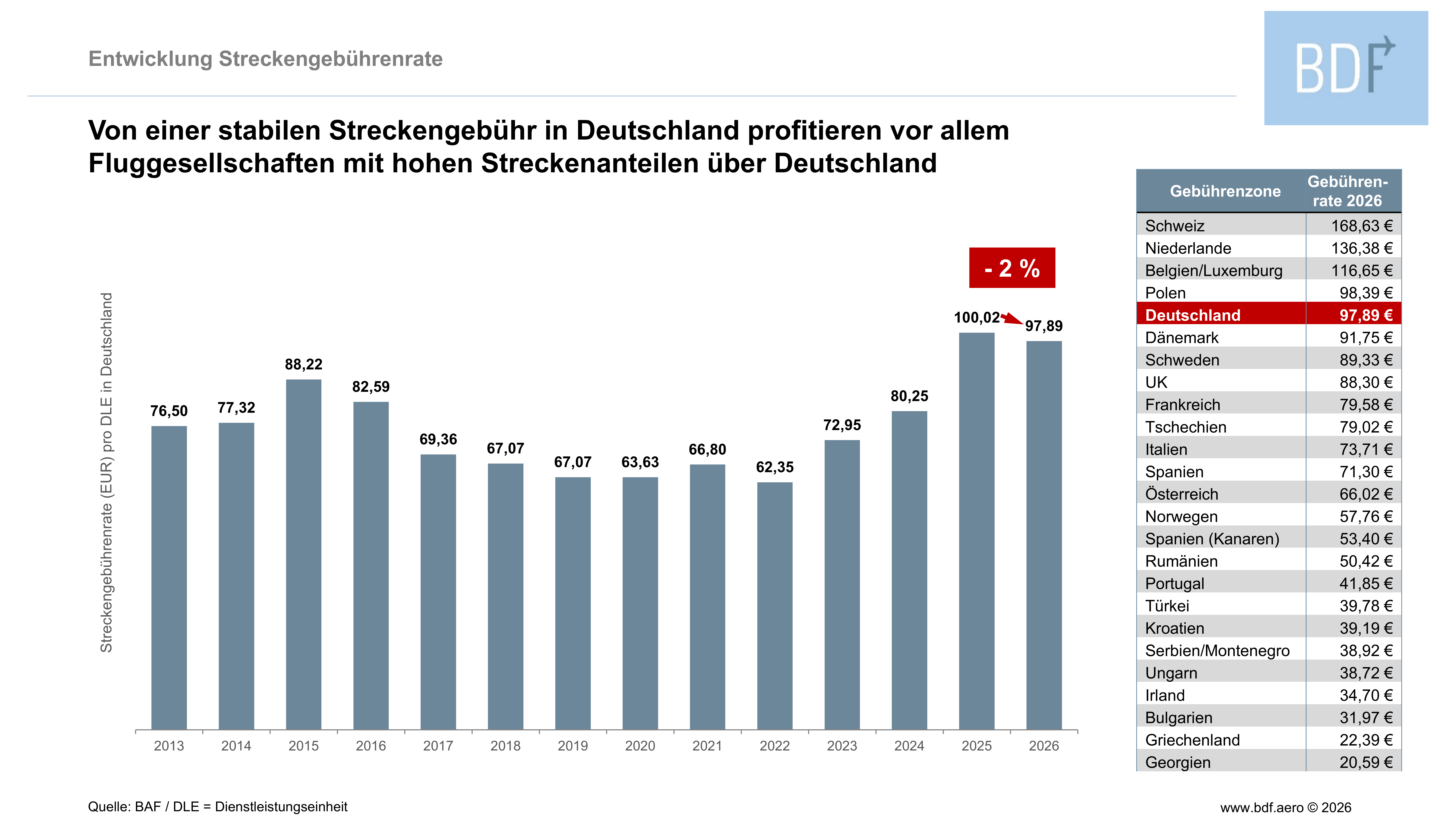 Damit können für einen Flug von A nach B unterschiedliche Streckengebühren anfallen, je nachdem, welche Flugstrecke eine Airline wählt. Die deutsche Streckengebühr liegt im europäischen Vergleich an fünfter Stelle. Von einer günstigen deutschen Streckengebühr profitieren vor allem Fluggesellschaften mit hohen Streckenanteilen über Deutschland.