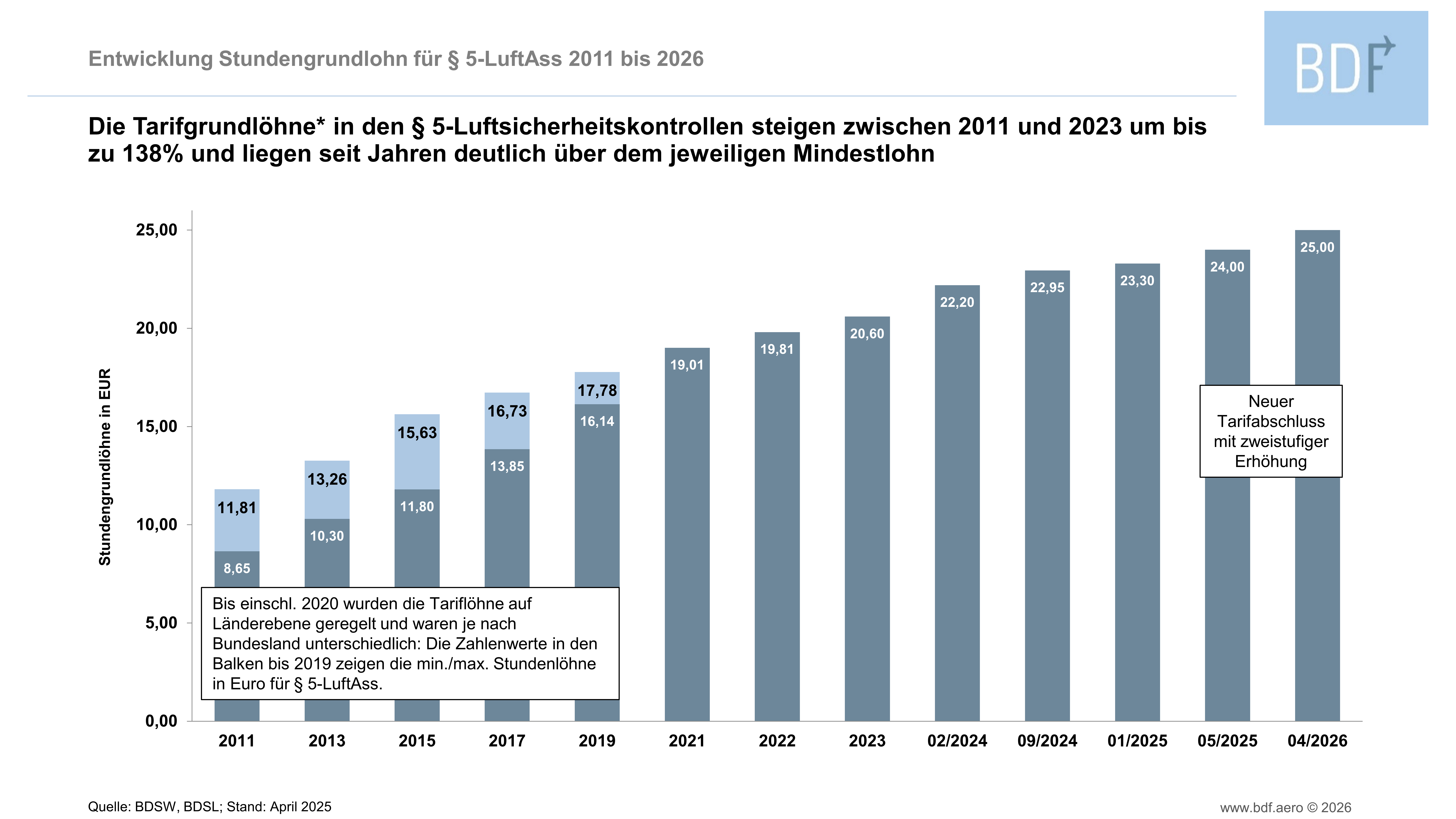 Seit dem 01.01.2021 ist die Bezahlung von Luftsicherheitsassistenten bundeseinheitlich zwischen den Tarifparteien vereinbart. Der bundeseinheitliche Tariflohn steigt zum 01.04.2026 auf 25,00 Euro/Stunde – ein Anstieg um bis zu 189 Prozent gegenüber 2011. Der monatliche Grundlohn eines Luftsicherheitsassistenten beträgt ab dem 01.04.2026 bei einem Vollzeitvertrag von 160 Stunden pro Monat demnach 4.000 Euro.